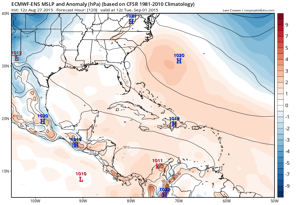 Although the steering flow off the SE US would likely be very weak early next week, IF Erika got strong in time to recurve east of Florida, the flow around the ridge would likely move it slowly northeast before it eventually started getting caught up in the westerlies off the Mid-Atlantic coast. We will have to monitor the forecast depth of the trough over the NW Atlantic over the next few days to ensure that a recurve away from the Mid-Atlantic and New England would remain the favored solution for a stronger Erika; if that trough becomes shallower or shifts farther east it could open the door for a track farther north…however, a lot would have to go very well for that to happen, and at this point I’m treating it as a very low probability event.
