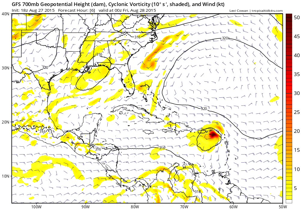 I suspect that the interaction with the mountainous Hispaniola and shear over the next 24 hours will likely cause Erika to at least temporarily degenerate into an open wave…however, the GFS and Euro both maintain a robust mid-level circulation past Hispaniola, which could foster redevelopment over the Turks and Caicos. This can be seen clearly on the 18z GFS depiction of 700mb height/wind/vorticity over the next 36 hours: