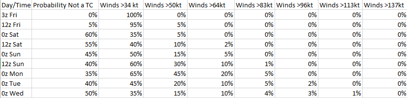 Note: The wind probability table doesn’t assume a track down the center line (although that is considered “most likely” and reflected in the probabilities). The probabilities take into account solutions that are less likely but still possible, such as a system intensifying quicker and staying east of Florida (which is why category 3 and 4 probabilities, while small, increase some while the overall forecast calls for weakening). There is a chance that a system is a classifiable tropical depression but not a tropical storm and not dissipated, which is why the dissipated and tropical storm or greater probabilities don’t always add up to 100%.