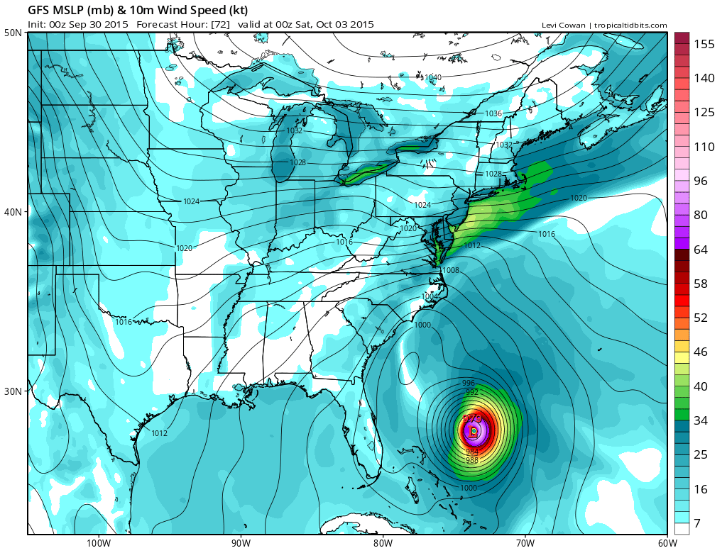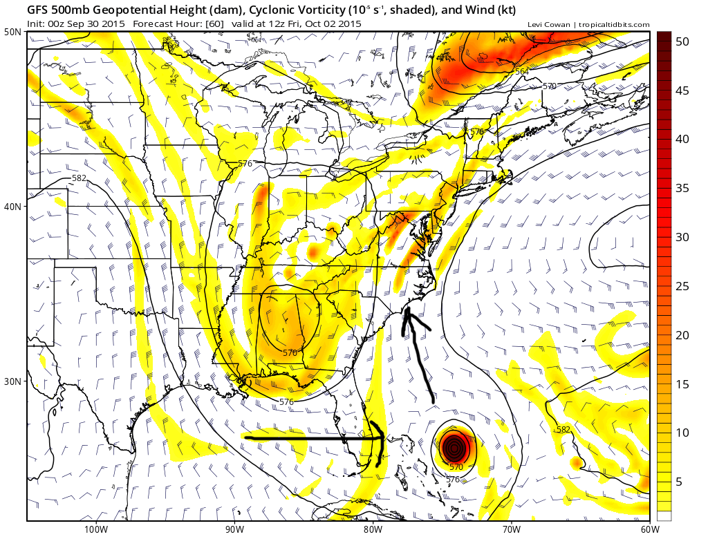 Where Joaquin goes over the next 2-3 days is also important. The farther SOUTH Joaquin is, the more likely it is to be “punted” east by the base of the trough. Note how near Joaquin’s latitude on the GFS there are westerly winds south of the trough, but just north the winds turn northerly. The farther north Joaquin is, the better the odds it doesn’t curve out to sea.