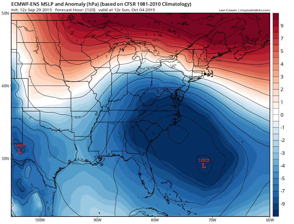 It’s somewhat counterintuitive, because a stronger Joaquin may track slightly more south in the near term, but could also help beef up the ridging which in turn may cause the trough to dig farther south anyways. The recent west trend in the models is generally associated with the global models showing a stronger Joaquin, so I believe a stronger system is more prone to hooking back towards the east coast.