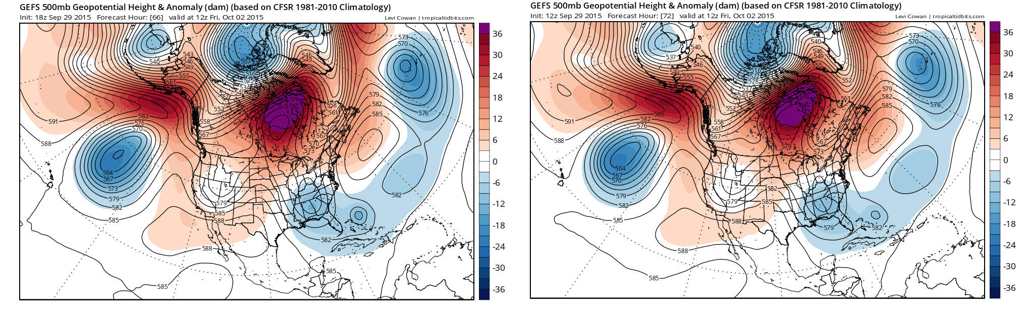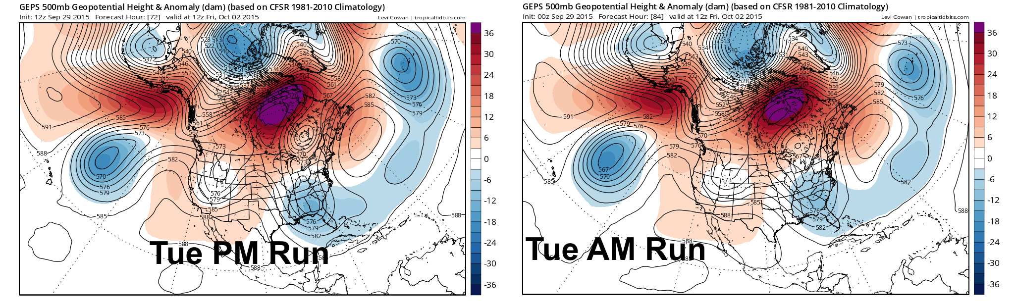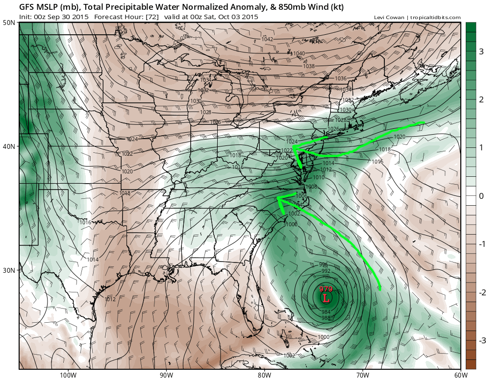 It should ALSO be noted that the trend on the GFS runs (0z Wednesday run continues the farther west trend) occurred when the model finally started properly depicting Joaquin’s expected near term strengthening. This makes sense, as a stronger hurricane would help amplify the ridging over the NW Atlantic, which at the end of the day makes a Joaquin eastern US landfall more likely.