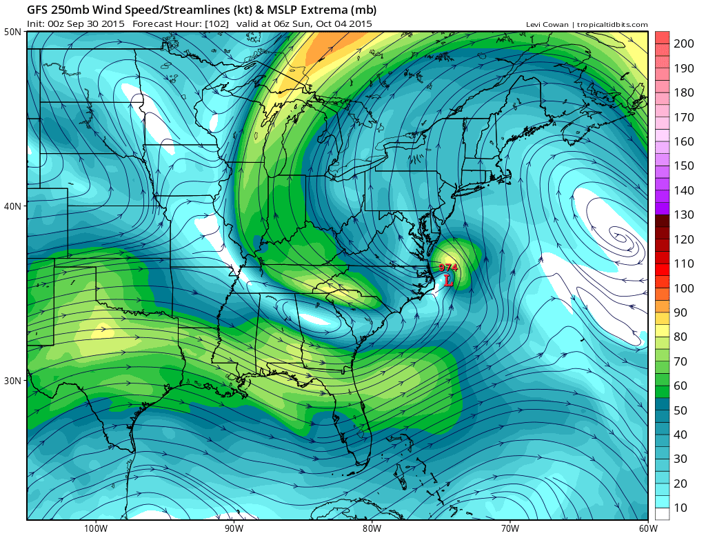 This jet streak could also start shearing Joaquin just prior to landfall. Unless Joaquin goes well north towards New England, I believe it would be mostly tropical at landfall due to warm SSTs up to near the landfall point and shear not increasing until just prior to landfall, although some degradation to the storm’s structure as it nears the coast and some weakening would still likely occur.