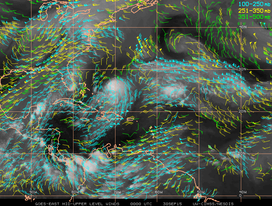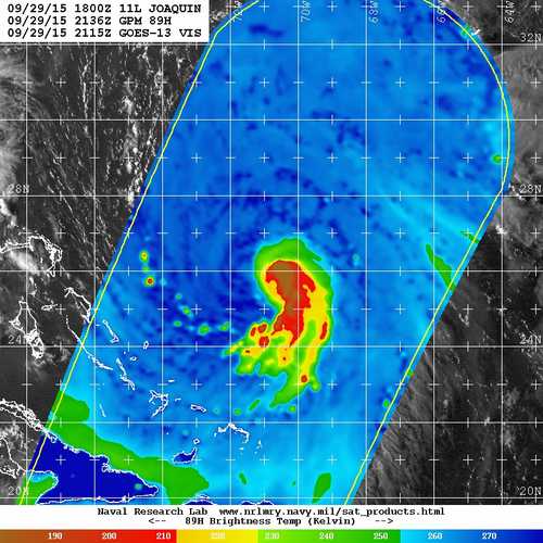 Recent convectional IR satellite imagery along with the most recent microwave pass that captured Joaquin (from around 5:00PM EDT Tuesday) show that Joaquin is still a sheared tropical cyclone, however very intense and persistent convection is occurring on the eastern side of the circulation, with evidence of curved banding and perhaps a formative mid-level eye on microwave data. Note how there’s a swirl of low level clouds on the microwave image near the northwestern edge of the convection, indicating the low and mid-level vortex of Joaquin weren’t quite well aligned at 5PM, as a result of moderate northwesterly shear on the cyclone. Although the structure wasn’t perfect this afternoon, as of 11:00PM Joaquin had maximum sustained winds of 70MPH and a minimum pressure of 988mb, which is a high end tropical storm.