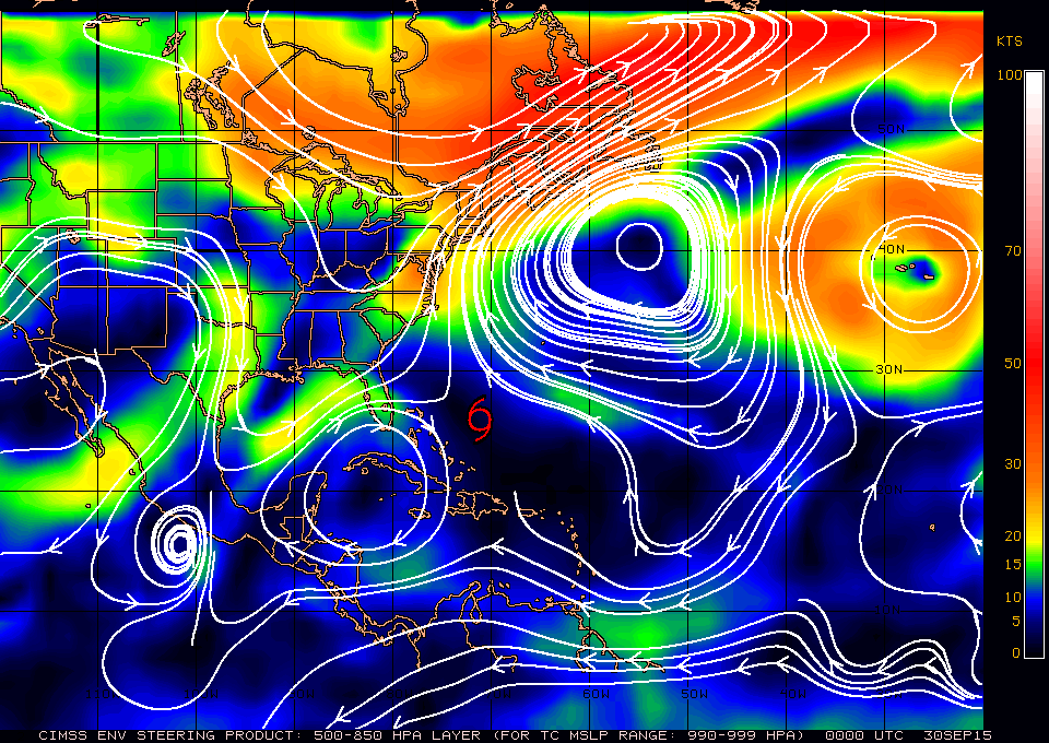 In the near term, as Joaquin continues to intensify, it appears that the ridge to its west may have increasing influence, as it appears to be stronger in the upper levels, per the layer of deeper steering currents shown in the above image. This could cause a west-southwest, but slow, motion to continue through the near term. However it’s important to note that if Joaquin does move farther north that it would feel increasing influence from the eastern US trough and ridge over the NW Atlantic. It’s also important to note that a stronger Joaquin would likely help pump up heights in the ridging over the NW Atlantic, which could ultimately try to push the storm farther west while also helping the trough over the eastern US amplify further.