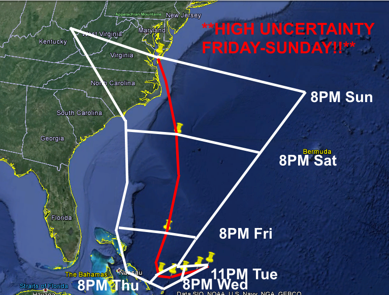 As of right now, I believe the left trend in today’s models made sense. My forecast track will follow the model consensus to very close to the central Bahamas, and then follow a 0z GFS/Canadian/UKMET/GFS ensemble blend. Further adjustments left could be needed if the trend for a pattern more conducive for a hard left turn towards the coast continue. The track forecast is delicate, so a miss out to sea is still possible. Continue to monitor this over the next few days!