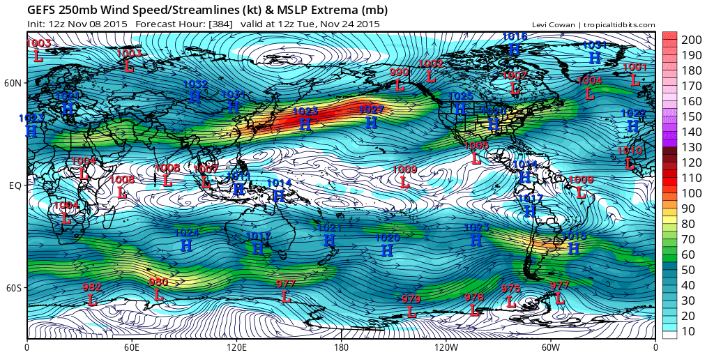 Both ensembles (GFS ensemble shown) begin extending the jet again after a few days, which would make sense if convection increases in the central Tropical Pacific in associated with the El Nino and very warm waters there. This leads me to believe that any Pacific driven cooldown around Thanksgiving would be short lived.