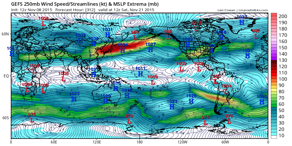 Last week I discussed how tropical forcing was becoming stronger from the Indian Ocean, and this has remained the case this week. This supports higher heights over a good portion of the northern Pacific and troughing over the western US. There is a bit of change this week as some convection has begun re-flaring in the Pacific just east of the Dateline, although the Indian Ocean convection has generally been stronger and more persistent this week. Here’s what the global jet stream looks like: