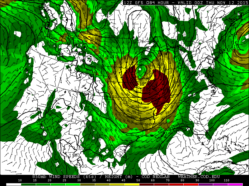 As we head towards mid-week, a very potent shortwave associated with a 150kt+ jet streak will eject out of the Rockies into the Plains and cause a strong lee cyclone to form and track towards the Great Lakes. The strong jet streak combined with a tight temperature gradient between cold with the trough moving out of the Rockies and persisting warmth over the southern and eastern US will allow this low to become quite deep as it tracks into the Great Lakes, possibly fostering an outbreak of severe thunderstorms and causing a large area of gusty winds behind the system: