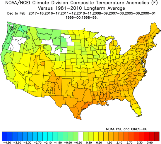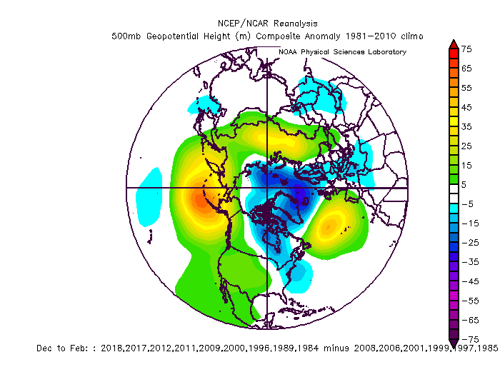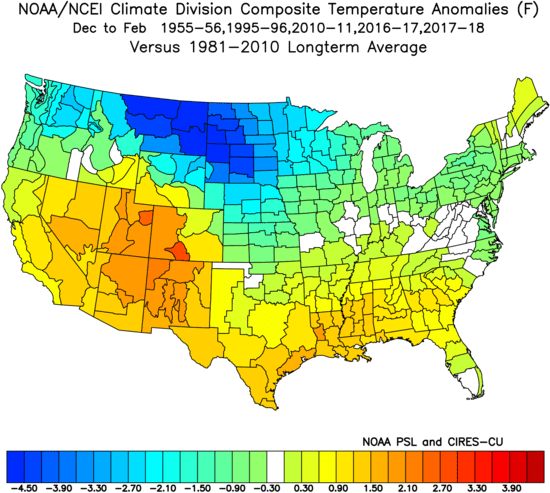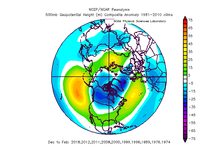 Gee thanks for nothing La Nina. Except for 10-11 and 17-18. Those are kind of OK. The last 10 Ninas, on average, fit the stereotype of starting colder than they end for the eastern U.S.: