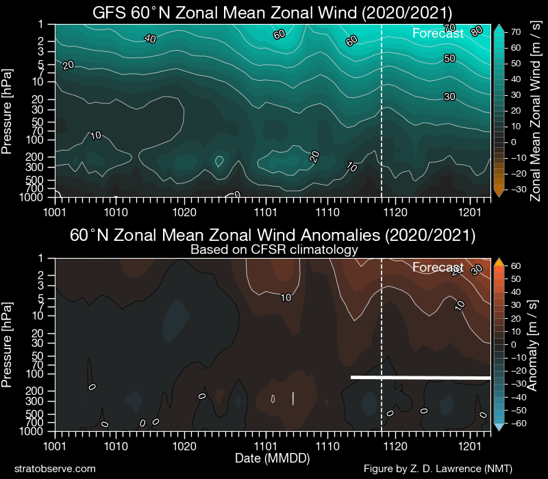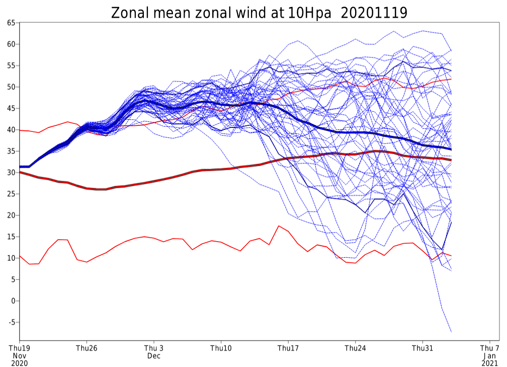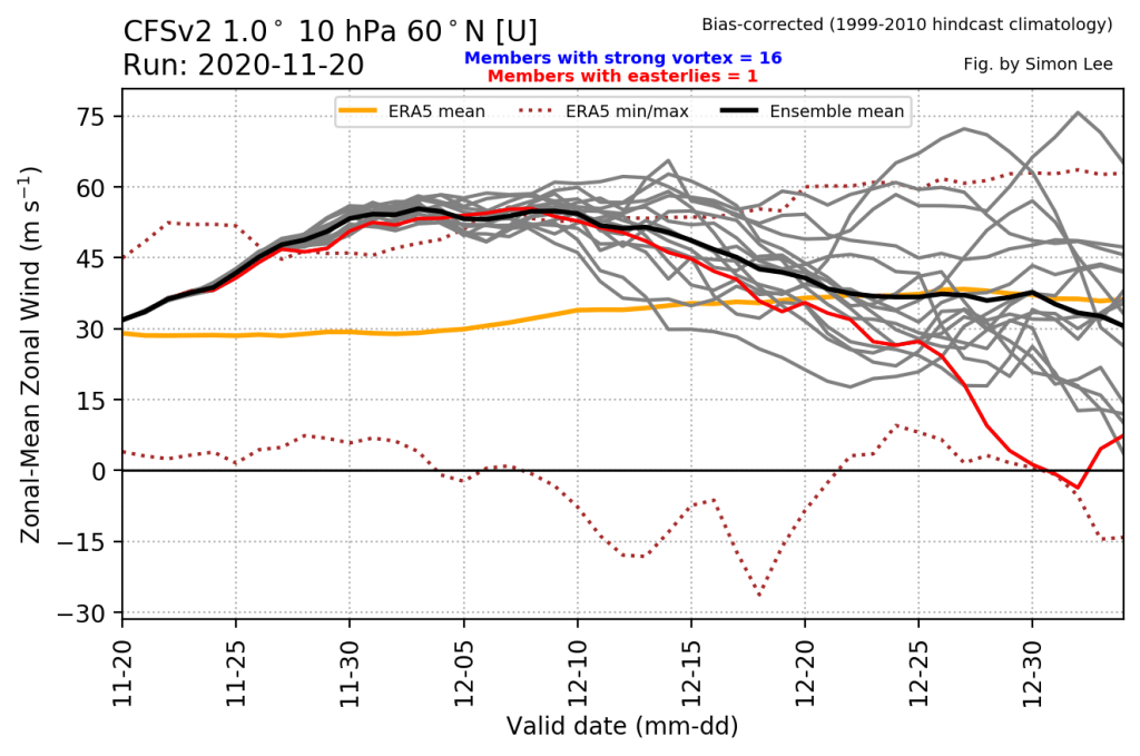 Part of the reason we couldn’t shake the anomalous westerly momentum in the high latitudes in early 2020 was because the stratospheric polar vortex was very strong and coupled to the troposphere. Nothing was moving that, apparently…despite the increase in AAM and more active MJO during the second half of last winter, and despite a lot of model hints that we would eventually move that. Fortunately, the stratospheric polar vortex, while becoming strong again, is not yet coupled to the troposphere (note how zonal wind anomalies below the white line are still comparatively weaker than higher up). If this doesn’t change in the short-medium range, it may provide for some hope for an eventually blockier pattern if other factors can align.