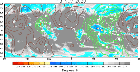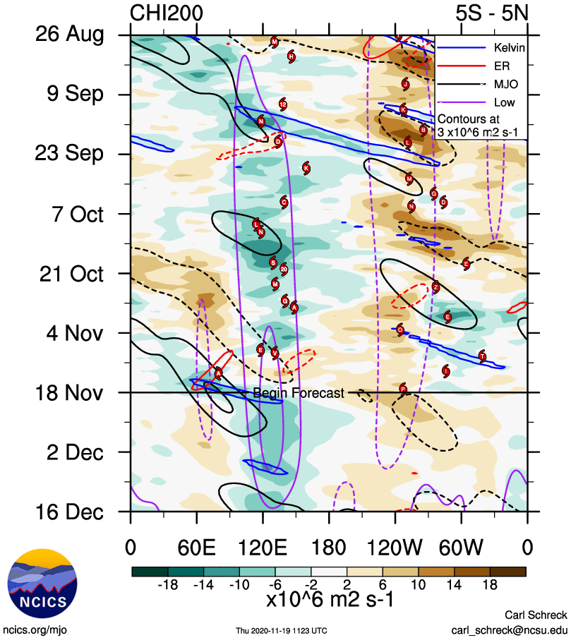This analysis on Dr. Mike Ventrice’s website shows similar, with the MJO and Kelvin wave constructively interfering right now. There may be brief subsidence behind the Kelvin wave, though I think the robust nature of the MJO and low-frequency forcing will offset that and allow the convection to continue propagating east. Yet another plot, this from Carl Schreck, shows the current constructive interference, and the potential for the low-frequency forcing centered near 120E (as discussed earlier) and warm SSTs to keep convection going to at least 120-150E into early-mid December: