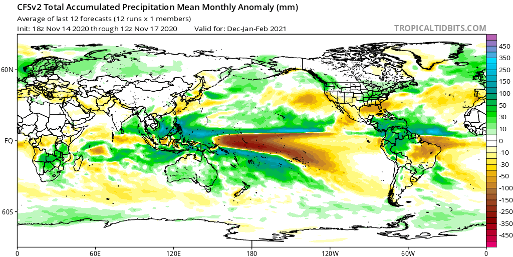 The CP events (B) have a stronger negative precipitation anomaly that is centered farther west, focused at or just west of the Dateline. The EP events have a weaker anomaly centered slightly farther east, closer to neutral years, perhaps muting the effect La Nina has on dampening the MJO into the western Pacific somewhat and allowing for more blocking to result. In a somewhat concerning trend, most of the seasonal models, that overwhelmingly have a +NAO for December-February and in some cases have a flatter north Pacific ridge, all have precip anomalies for the winter that look more like a CP event: