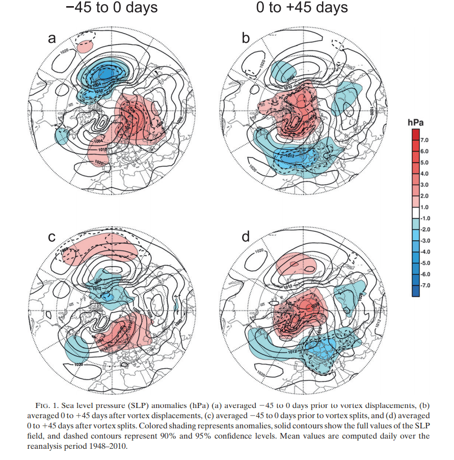 A is the proceeding pattern in the 45 days prior to a vortex split, C is the pattern in the 45 days prior to a displacement. Both similar, though the Aleutian low and Scandinavian ridge are more amplified proceeding the splits. Another set of maps from the same paper shows similar