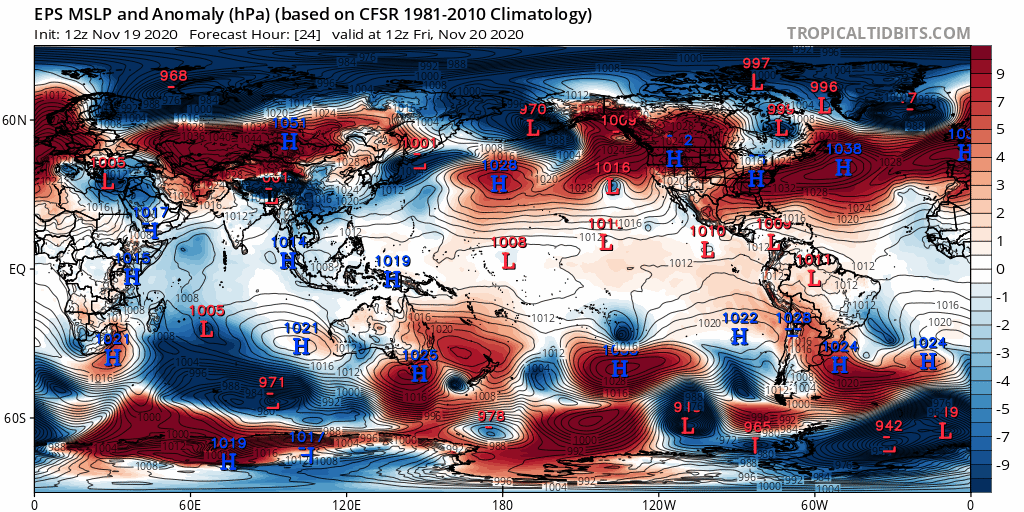 This will lead to an acceleration of the east Asian-Pacific jet (the tropical forcing moving east towards 120-150E will also contribute to that). There’s also some minor signal on the EPS for an increase in West Pac tropical cyclone activity around the beginning of December (the GFS and GEM have had a number of false alarms while the EPS has remained much more bearish thus far).