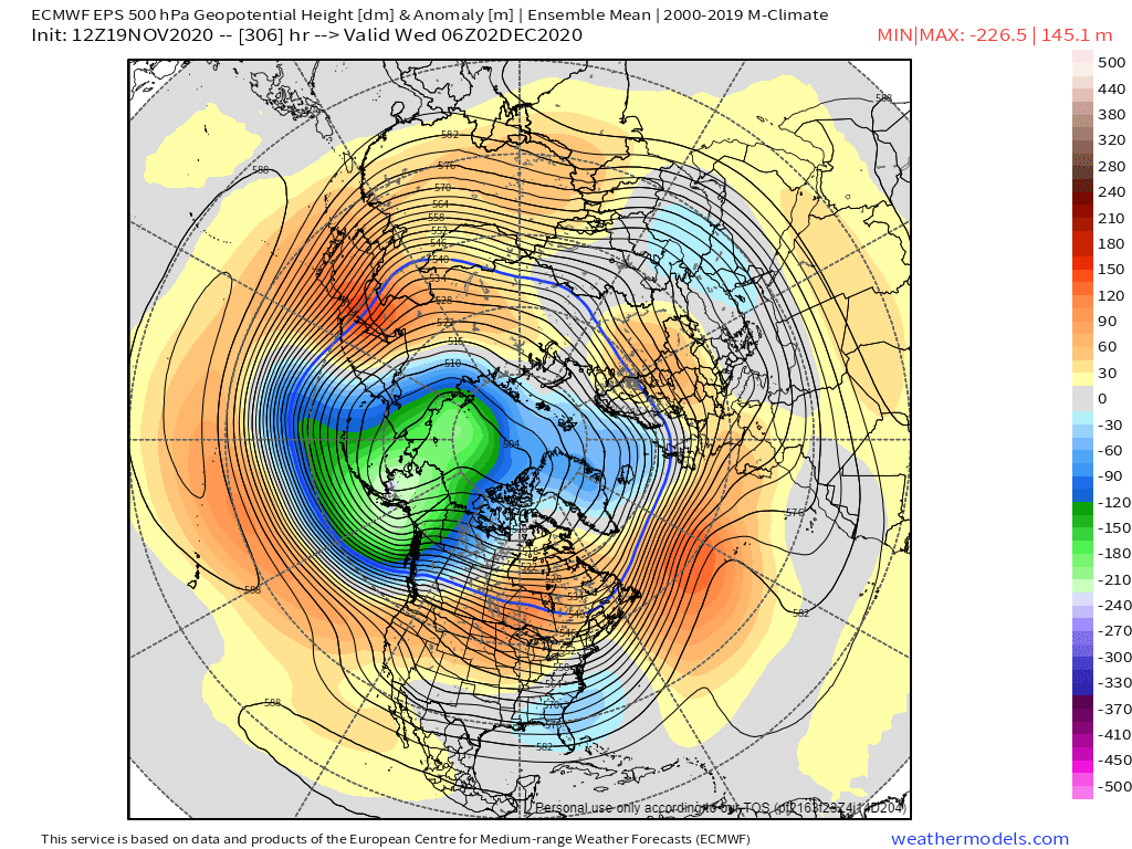 The wavelengths in early December aren’t long enough to support a trough from 160E to 100W, and a ridge from the West Coast of the U.S. to eastern Canada. While it’s likely it’s generally troughy and generally ridgey in those areas, the pattern will probably be quite a bit wavier than an extended ensemble mean implies, which will allow for a bit more cold air to be available than modeled, and along with the active sub-tropical jet may bring snow potential when / if there’s enough polar jet influence. Given the STJ involvement, if marginally cold air can get displaced well into the CONUS any snow threats, in a more Nino-like fashion, may not favor the northern tier.