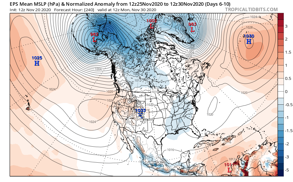 So, we likely won’t see an immediate rise rise in heights over Alaska, but if the SPV moves away from Alaska and the TPV backs west…which the EPS and GEFS consistently show both at the moment…the wave breaks would eventually have a much easier time trying to raise heights on the West Coast and into Alaska. Initially in late November and early December, the lack of height rises over Alaska will result in the PNA rising, but the EPO won’t drop immediately. The op models consistently have a very progressive, wavy pattern with sub-tropical support to end November and start December with a +PNA look. The ensembles don’t look very stormy yet in this regard, but their mean pattern by the end of November / early December is too smooth: