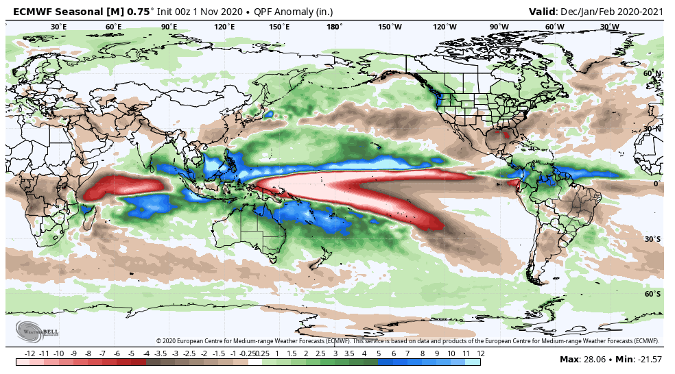 2 is the Indian Ocean. Last year saw a strong positive Indian Ocean Dipole event, with cool waters near Australia and warm waters closer to Africa. This contributed to convection/forcing frequently sitting over the western Indian Ocean during the fall of 2019 and into the first half of winter, with a dearth of forcing over the Pacific, especially in the critical period when the polar vortex began wrapping up in December and early January. This fall, the IOD is neutral to perhaps slightly negative. This argues for the low frequency forcing centering farther east than last winter, but in tandem with the much stronger La Nina doesn’t necessarily promise that the MJO frequently gets far into the Pacific.