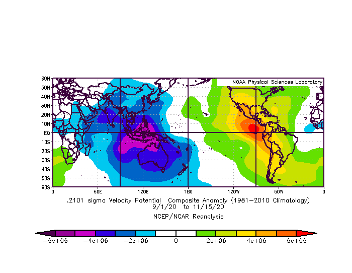 We’ve clearly had a La Nina response to the low frequency forcing this summer and fall, with rising motion over the Indian Ocean and sinking motion over the Pacific. It can be argued the forcing drifted east some over the course of the summer and fall. Another way to visualize this is on a map showing velocity potential from September – November 15: