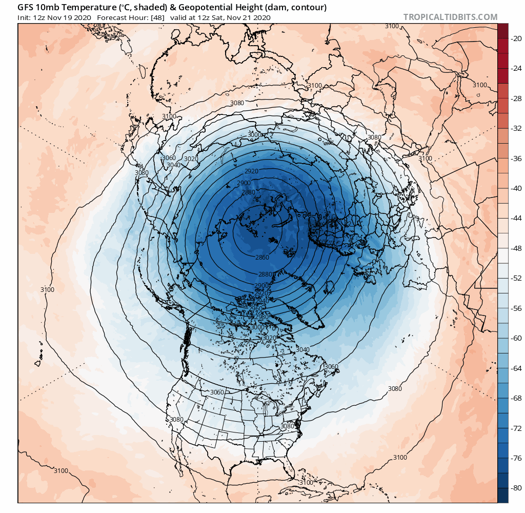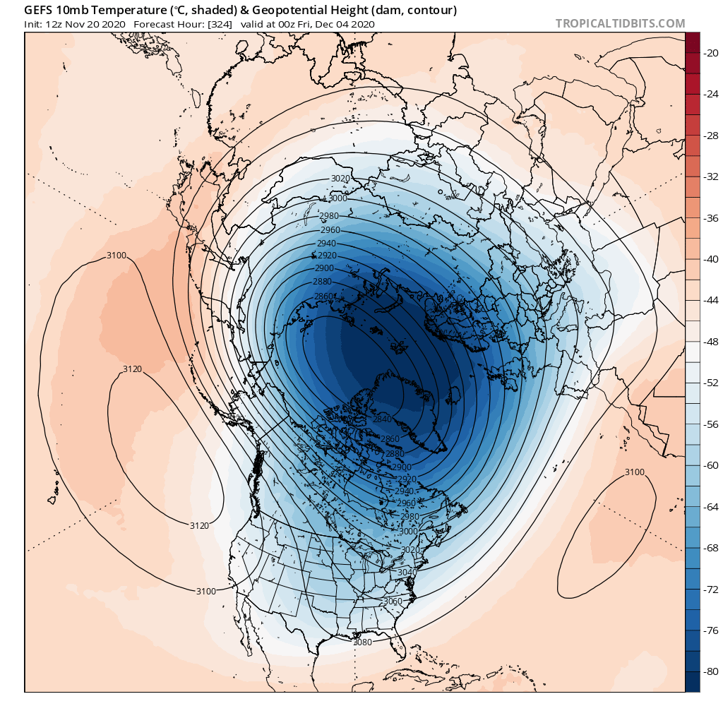 As referenced above, the polar vortex is quite strong, but not well-coupled with the troposphere yet, and is occasionally getting knocked around and stretched a bit. So, while it is currently a signal for mild weather, it’s not an entirely hopeless proposition for it to weaken at some point as it was last January – March. The pattern showing up somewhat consistently on guidance the rest of November into early December is likely a more favorable pattern for disrupting the polar vortex than what we saw early this month.