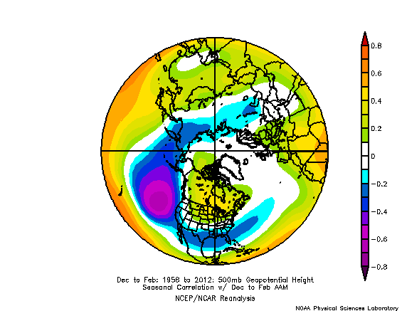 Above is the seasonal correlation to AAM in DJF. The correlation is weak in much of the U.S., but in general higher AAM features a +PNA pattern with higher heights over Canada and lower heights over the southern U.S…basically a typical El Nino pattern. If you inverse the colors (use imagination) and emulate the correlation for a -AAM, it looks much more like a La Nina with higher heights off the West Coast and across the southern U.S. and lower heights over much of Canada.
