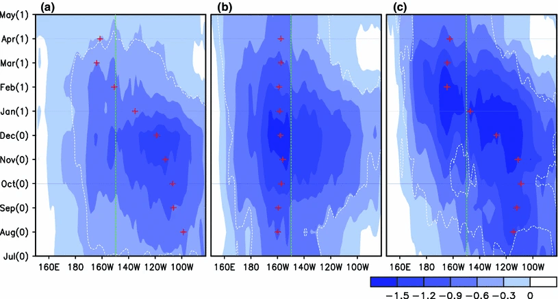 From the same paper, above is the typical SST departures with time in East Pacific, Central Pacific, and hybrid La Nina events. The key difference between eastern and central events is that in eastern events, the cooling originates near South America and propagates west, while in central events the cooling is centered near 150W. Central events also tend to be stronger, though there are exceptions both ways.
