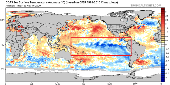 We’ll start with the moderately strong La Nina event across the Pacific. This developed over the summer and has strengthened through the fall, and the atmosphere has clearly responded. The La Nina is currently moderately strong and will likely be at moderate to borderline strong strength for the winter.
