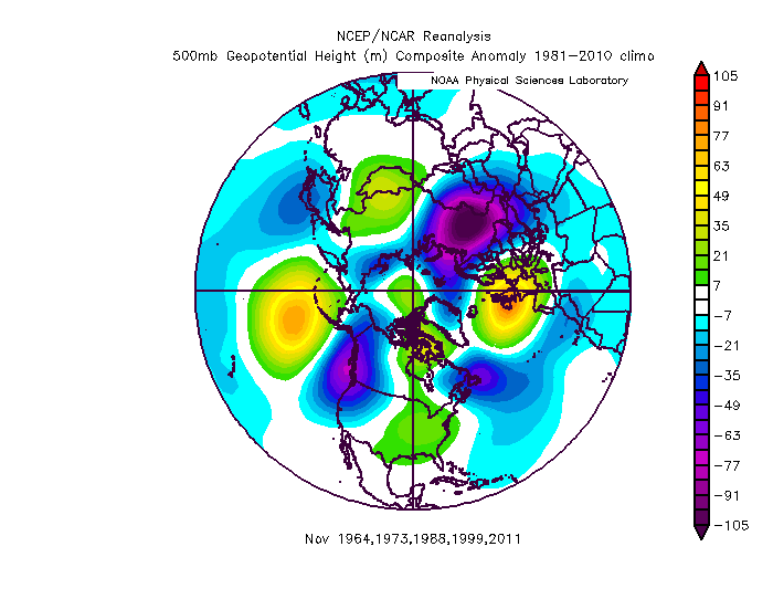 Unfortunately, most of these years were horrible matches to the pattern we’re seeing this November. The few years that made an analog tier higher than “also ran” that had a November pattern that was even somewhat palatable compared to this November were: 64-65, 73-74, 88-89, 99-00, and 11-12. Here was their composite November pattern: