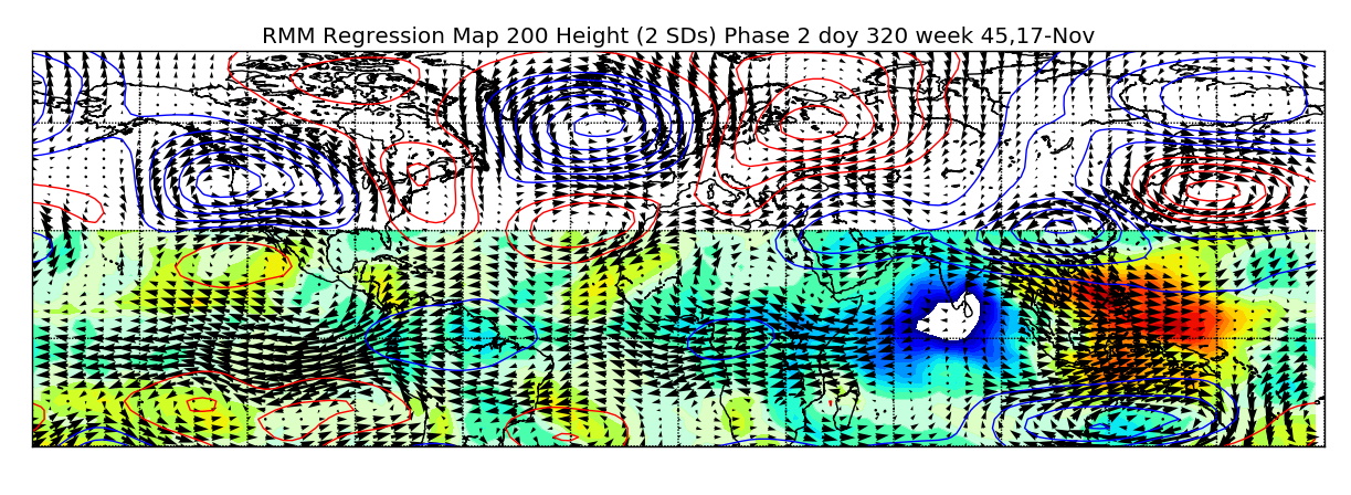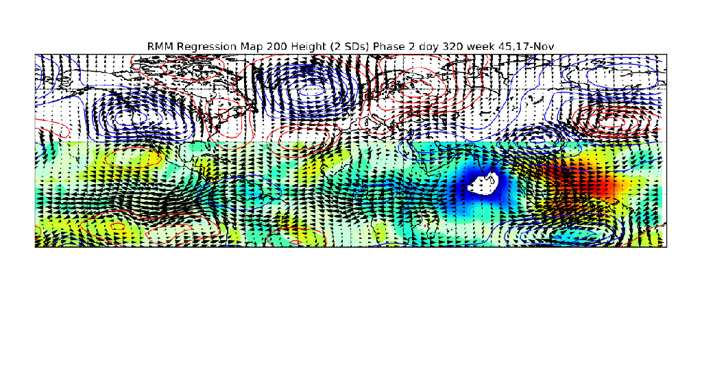Another tool, from Paul Roundy (http://www.atmos.albany.edu/facstaff/roundy/waves/), shows the typical MJO response at much finer scales than three-month periods. In transition seasons, when the wavelengths typically change quicker than a 3-month mean will capture, these regressions add quite a bit of additional value.